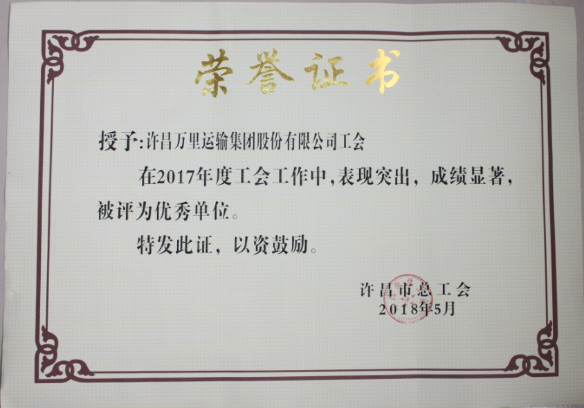 5月25日,在许昌市总工会六届二次全委会议上,许昌万里运输集团股份有限公司工会受到通报表彰,被授予“2017年度许昌市工会工作优秀单位”。这次受表彰的13个工会工作优秀直属基层工会中,公司工会是唯一的非公企业工会。 2017年以来,公司工会深入学习贯彻习近平新时代中国特色社会主义思想和党的十九大精神,紧紧围绕企业中心工作,在培养职工素质、促进劳动关系和谐、服务职工群众等方面认真开展工作,竭尽全力为职工做好事、办实事,取得扎实成效,连获佳绩,进一步加强基层工会工作,提升工会的吸引力和凝聚力,有力促进公司在市场竞争中逐渐占据主动,安全生产形势总体平稳,职工群众获得感、幸福感、安全感不断提升。 |