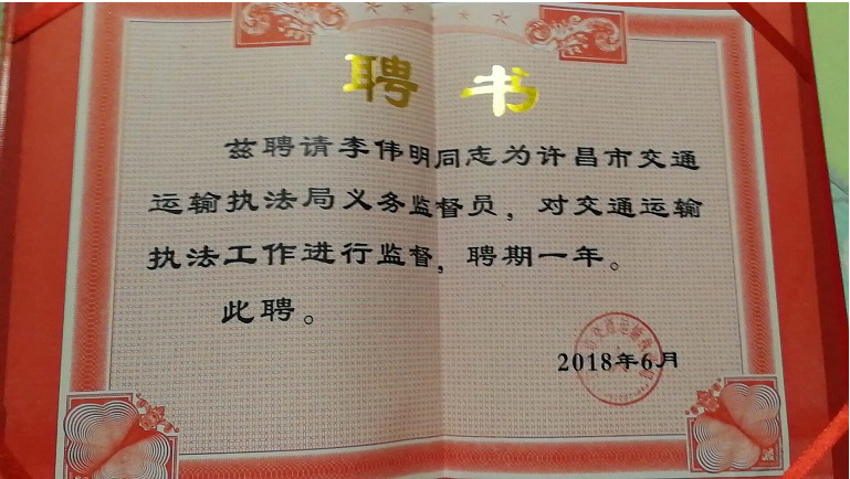 经过为期半年的考核和激烈竞争,许昌万里客运有限责任公司李伟明从全市380多名竞聘者中脱颖而出,荣获许昌市交通执法监督员的职位。
