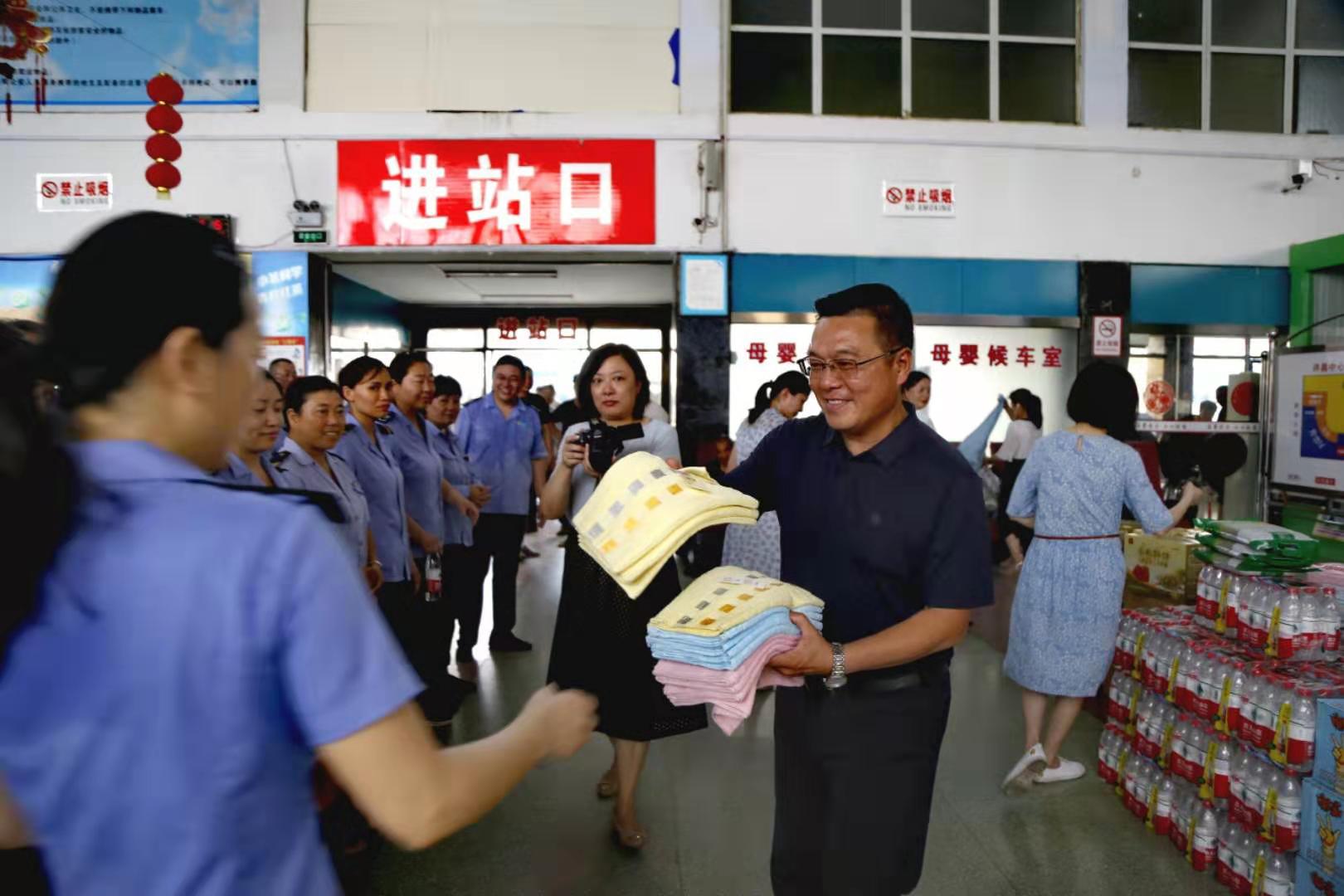 7月26日上午,骄阳似火,地面气温高达37℃,市总工会副主席王卫刚、帮扶中心主任左秋珍、市交通运输局工会主席刘志贤一行莅临许昌中心汽车站,慰问在高温下坚守岗位的许昌万里客运有限责任公司员工代表,向一线员工送去防暑降温用品。许昌万里运输集团党委书记兼总裁陈立干、万里运业股份有限公司总经理王柏强、集团工会主席赵霞等相关领导参加慰问活动。 俗话说“大暑大暑,上蒸下煮”。大暑已至,日晒、暑热与水湿互结,达到一年中的高峰,此所谓“桑拿天”。酷热的天气里,许昌万里客运有限责任公司员工为了确保道路客运的安全有序进行而依然坚守在各自的岗位上。 王卫刚副主席一行在许昌万里运输集团党委书记兼总裁陈立干及王柏强、赵霞等领导的陪同下,到车站候车大厅,看望慰问正在现场辛勤工作的站务员,发放冰红茶、沙琪玛、毛巾、绿豆等降温防暑物品,让他们顿感心情舒畅清凉绕。在现场,王卫刚副主席对员工不畏酷暑高温,坚守岗位的精神予以充分肯定,对辛勤工作的员工致以亲切的问候,勉励大家立足本职、爱岗敬业、爱护身体、多做贡献。 陈立干书记饱含深情地表示,市总工会王主席带来市总工会的真挚关怀,使我们在酷暑中真正体会到工会的真情,衷心感谢上级领导的关怀与厚爱。各位员工以更强的事业心、更大的责任感做好旅客平安运送工作,做好“迎进来、跟上去、送出门”全程服务。注意安全,注意防暑。 炎炎酷暑,市总工会对一线员工的关爱如清风拂面,为坚守岗位的员工带来一片清凉。不仅提高员工自我保护意识,营造良好和谐的工作氛围,还与公司落实劳动保护和防暑降温措施相得益彰,促进高温季节公司安全生产。