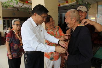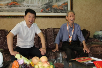 国庆节前夕,许昌万里运输集团董事长陈宇飞、党委书记陈立干兼总裁分别走访慰问离休老同志,并向他们赠送由中共中央、国务院、中央军委颁发的“庆祝中华人民共和国成立70周年”纪念章,并送上亲切问候。 “在中华人民共和国成立70周年之际,党中央、国务院、中央军委决定向新中国成立前参加革命工作的老战士、老同志颁发纪念章。公司有10名离休同志获此殊荣,都是建国前参加革命工作的老同志,在公司工作期间,任劳任怨、兢兢业业,为交通运输和企业发展事业做出了重要贡献。”陈立干书记深情地说。颁发“庆祝中华人民共和国成立70周年”纪念章,是新中国成立70周年系列庆祝活动的重要组成部分,对于加强爱国主义教育,培育和践行社会主义核心价值观,增强中国特色社会主义伟大事业凝聚力和感召力,具有十分重要的意义。 在离休干部赵永雷同志的住所,陈立干书记为他佩戴纪念章,介绍纪念章的基本情况,代表公司党委、董事会向他致以崇高敬意和诚挚问候。同时还为他送去中国共产党章程和慰问金,叮嘱他注意身体健康,以积极的心态迎接新中国成立70周年。赵永雷接过纪念章,感谢国家的培养,感谢公司党委的关怀!他于1947年3月在河北磁县参加八路军,1949年5月加入中国共产党,1972年11月到原许昌市运输公司工作,1990年6月经市政府批准提为县级干部待遇。 在离休干部冀玉亭同志的家中,陈宇飞董事长与他亲切握手,并送上慰问金。详细了解冀玉亭的身体状况和生活情况,感谢他为企业、为国家作出的积极贡献,为他戴上“庆祝中华人民共和国成立70周年”纪念章。并告诉他,获得'庆祝中华人民共和国成立70周年'纪念章,是党中央、国务院、中央军委对革命老同志的高度赞誉,对革命老同志来说是一件无比光荣的事情。冀玉亭激动地表示,感谢党和国家给予我如此高的荣誉,祝愿祖国更加繁荣昌盛。他于1945年5月参军入伍,1948年7月加入中国共产党,有着将近70年的党龄,曾经参加过郑州战役、襄阳战役、淮海战役等,1954年1月转业到许昌工作。 此次走访慰问,许昌万里运输集团工会主席赵霞等同往。