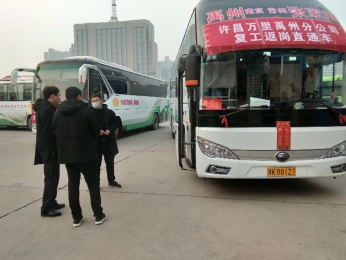 旅游分公司接送60位四川省眉山市农民工来许复工 2月24日上午9:00,旅游分公司派出车辆从 许昌出发,前往四川省眉山市仁寿县接送60位农民工来许复工。 许昌万里客运有限公司接到东城区管委会的通知,派车辆到四川省眉山市接送60位农民工来许复工,由旅游分公司承担此次运输任务。旅游分公司根据需要复工人数,组织车辆(豫KC3319、豫KC9925、豫K53051,三辆车共计140个座位)。旅游分公司负责人聂应军带领工作人员及车辆到达指定位置后,对参运驾驶员进行安全行车教育,安排专人对车辆内外进行消毒工作。 许昌市东城区管委会、许昌市公安交警支队、许昌市东城区规划建设局、许昌电视台等多部门高度重视,许昌市交警支队主要负责人到现场安排工作。市公安交警支队特派12名警务人员、两辆警车全程协助,东城区管委会也安排两辆保障车全程跟随,多家媒体全程跟随,对万里客运的工作给予赞赏与肯定。