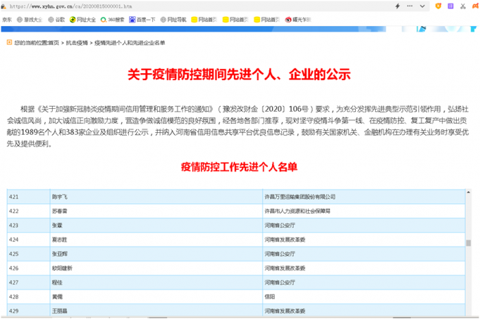 因坚守疫情斗争第一线、在疫情防控、复工复产中做出贡献,河南省发展和改革委员会通过“信用中国(河南)”网站公示疫情防控工作先进个人陈宇飞、疫情防控工作先进企业许昌万里运输集团股份有限公司,纳入河南省信用信息共享平台优良信息记录,鼓励有关国家机关、金融机构在办理有关业务时享受优先及提供便利。 许昌万里运输集团股份有限公司董事长陈宇飞在疫情防控工作先进个人名单中的序号是“421”, 许昌万里运输集团股份有限公司在疫情防控工作先进企业名单中的序号是“174”。 为充分发挥先进典型示范引领作用,弘扬社会诚信风尚,加大诚信正向激励力度,营造争做诚信模范的良好氛围。经各地各部门推荐,河南全省1989名个人和383家企业及组织在“信用中国(河南)”网站公示。 点击信用河南公示链接查看疫情防控工作先进个人名单、疫情防控工作先进企业名单:(https://www.xyhn.gov.cn/ca/20200815000001.htm)。 |