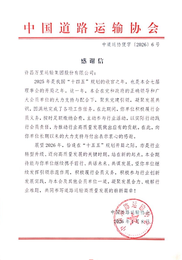 近日,许昌万里运输集团收到中国道路运输协会发来得感谢信(中道运协便字(2026)6号)。中国道路运输协会在信中,高度评价双方在行业生态、行业文化建设中紧密协同联动,充分肯定许昌万里运输集团在推动行业高质量发展中展现的专业能力与责任担当,并表示将继续深化合作。 许昌万里运输集团始终坚持“以人为本,改革创新,忠诚守信,追求卓越”的理念,凭借扎实的技术实力、强大的产业优势与丰富的实践经验,融入大交通、协同多方面,服务国家战略、服务城乡发展、服务美好生活、服务客户需要,走在中国道路运输百强诚信企业之前列。聚焦新质生产力、强化品牌标杆力,产、学、研、投、服、用一体化,打造战略投资平台、产业经营平台、科技创新平台,建设产教融合型企业。汇聚源源不竭的向上力量、向善力量,创新探索“龙头产业拉动,多产业协同,资本与信息支撑”发展路径,建设国内一流、世界知名的综合实业集团。为道路运输行业高质量发展建言献策,持续推动合作成果转化与行业资源共享,为道路运输产业提质增效注入源源不断的创新活力和智慧动能。 许昌万里运输集团是交通运输部一卡通互联互通密钥授权使用单位、交通运输部重点联系道路运输企业,也是道路货物运输特级企业、道路旅客运输一级企业、河南省省定重点上市后备企业。继续发挥引领示范作用,积极参与行业创新发展实践,与中国道路运输协会及各方力量同心同德、同向同行,凝聚发展合力、破解行业难题,共同书写道路运输高质量发展的崭新篇章。 |